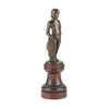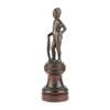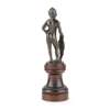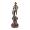 bronze, dark brown/green patina, mounted on a turned wood pedestal