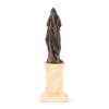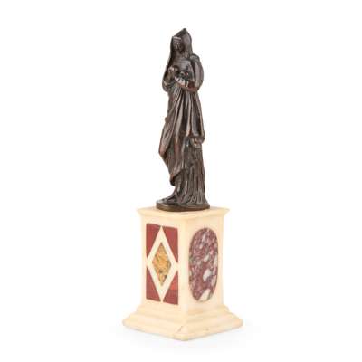 dark brown patina, on a white marble square pedestal with specimen marble insets, possibly from a crucifixion group