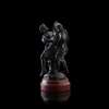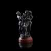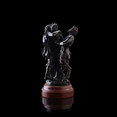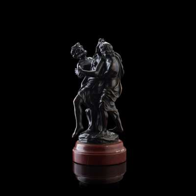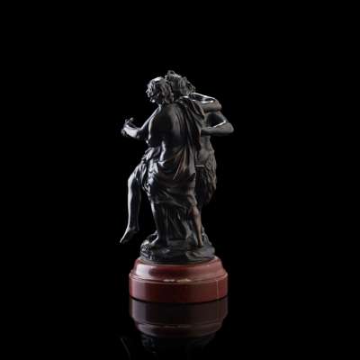 dark brown black patina worn to reveal a light brown lacquer, modelled as a satyr with a young couple embracing in dance, a syrinx at their feet, mounted on a circular moulded rouge marble base