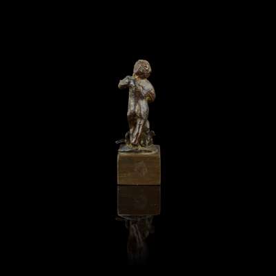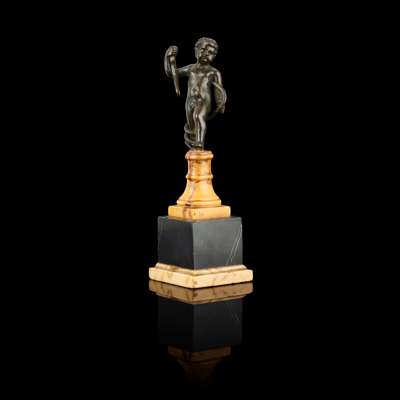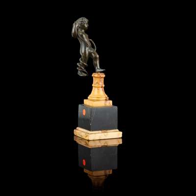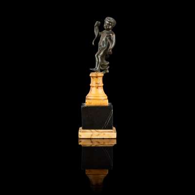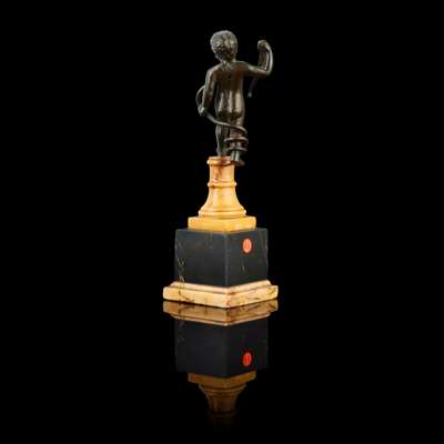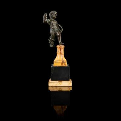on a later bronze rectangular plinth, incised with collection number 455; together with AN ITALIAN BRONZE FIGURE OF A PUTTO WITH A SNAKE, on a siena and black marble stand, 7.4cm high, 16.3cm overall (2)