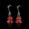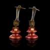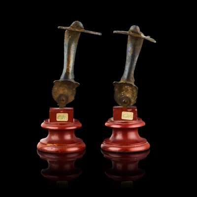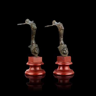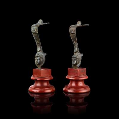 of S profile, each cast with a head profile and mask, on turned rouge marble bases (2)