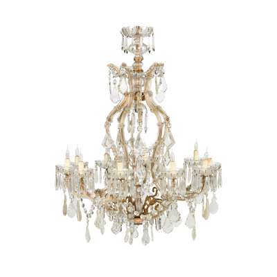 the encased open cage frame issuing nine scrolling candle branches hung with crystal swags, prisms, and pendent drops, the stem centred by a further single light