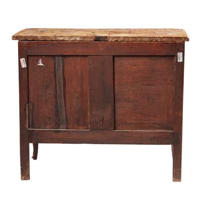 A LOUIS XVI TULIPWOOD, KINGWOOD, AND AMARANTH MARBLE TOPPED COMMODE