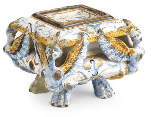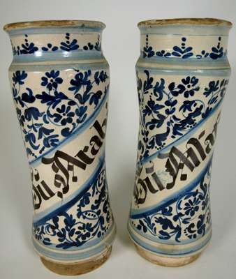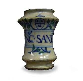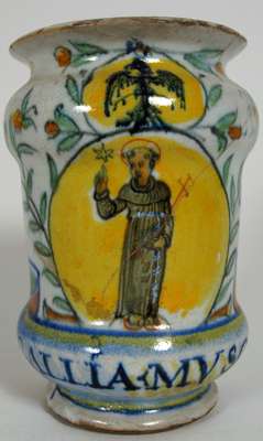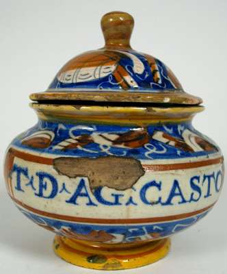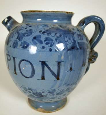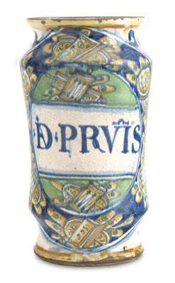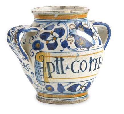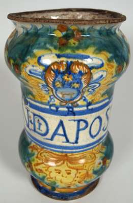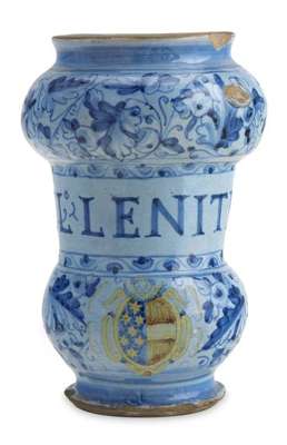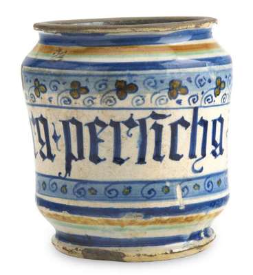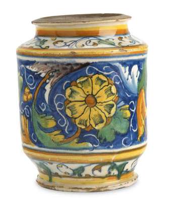 An late 16th century Montelupo maiolica syrup jar, circa 1580-1600