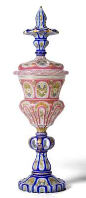 An impressive late 19th century Bohemian opaque, pink and blue glass pedestal vase and cover