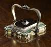 shaped oblong, decorated with scroll and formal foliage and set with ruby cabochons, with a shaped swing handle above a tortoiseshell oblong panel hiding a compartment, surrounded by a malachite inlaid border, engraved to rim 'A MON AMI CHARLES DE MORNAY SOUVENIR DE MON AMITIE 1840' and 'FOSSIN ET FILS JOALLIERS DU ROY'