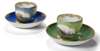 with gilt scroll work, the blue ground cup painted with a titled view of Meissen; the green ground example with a titled view of Dresden, the saucers reserved with floral sprays, underglaze blue crossed sword marks (4)
