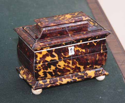 of rectangular bombé form, the pagoda top lid concealing two foil lined compartments with ivory button tortoiseshell covers, on ivory bun feet