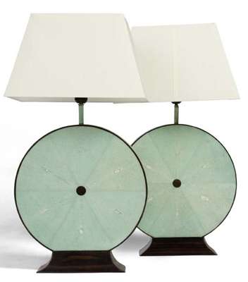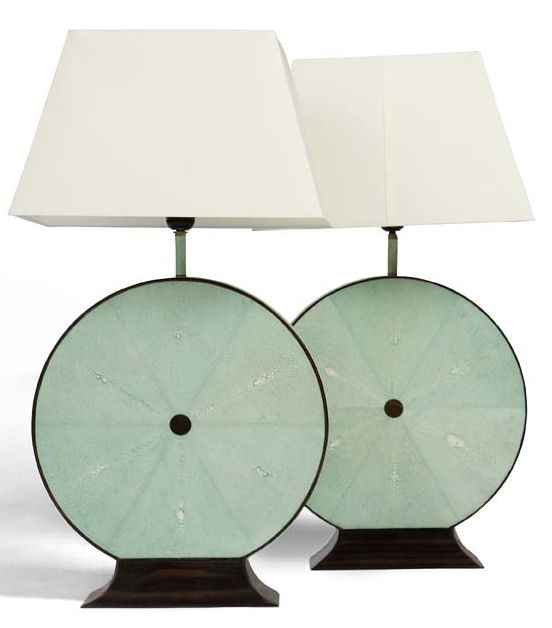 the shagreen covered wheel shaped bodies with rosewood borders and central roundel, on spreading bases (2)