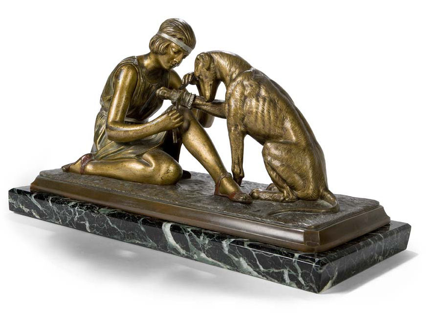 a bronze group depicting a tunic clad kneeling maiden bandaging the leg of her faithful hound, base inscribed Chiparus, mottled marble plinth base
