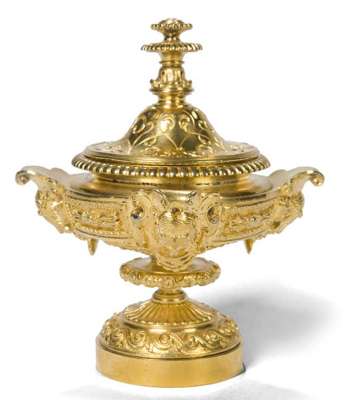 richly decorated in Renaissance revival taste, the knopped and domed cover concealing a nib apertures and a ceramic inkwell, the mask applied hemispherical body on knopped stem and circular base