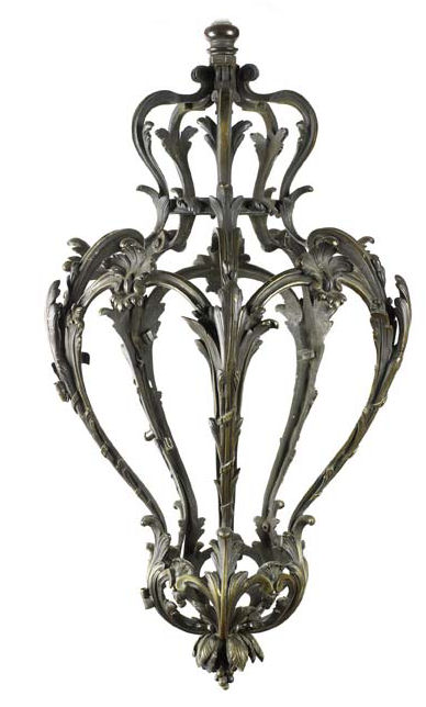of hexagonal baluster shaped form, formerly with glass panels, the crown shaped cresting on a later fixed faux 'chain' gasolier mount with original leaf cast rose stamped 'ABERCROMBIE', the rocaille crestings on boldly chased and pounced ribbon-tied acanthus leaf uprights terminating in a berried and leaf cast knop pendant, the single side-hinged access door with a small beaded circular handle