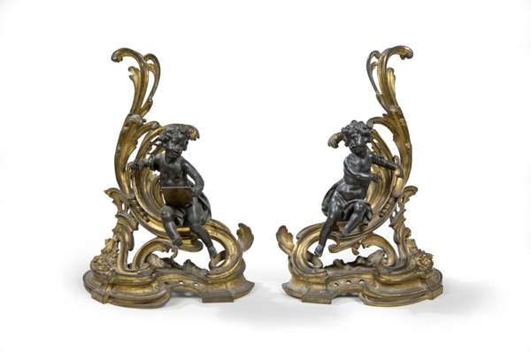 A pair of gilt and patinated bronze chenets In the Louis XV style