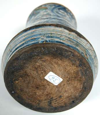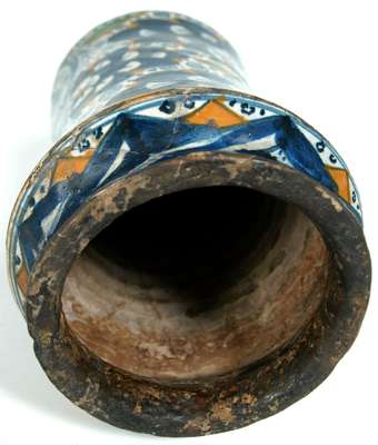 of shouldered slightly waisted cylindrical form, painted allover in dark blue, green and orange with Persian palmettes, leaves and scrolls, with two bands of 'nastri' or interlacing zig-zags on the shoulder and neck