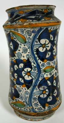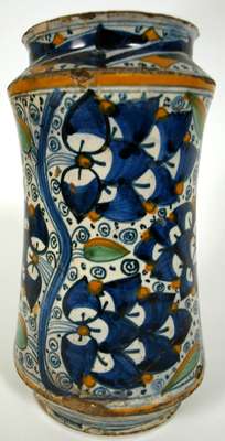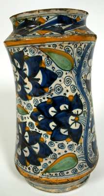 Similar jars illustrated in Bernard Rackham, 'Catalogue of Italian Maiolica with emendations and additional bibliography' by J.V.G. Mallet, (London, 1977), cat. 333, pl. 55, p.116 and Jeanne Giacomotti, 'Catalogue des Majoliques de Musees Nationaux', (Paris, 1974), p. 39, cat.143.