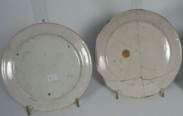 painted with figures in a woody landscape beside a column with a building in the background, 17.5cm diameter; and another, painted with columns and trees with a building and mountain in the background, 18.5cm diameter (2)