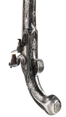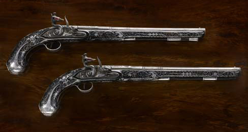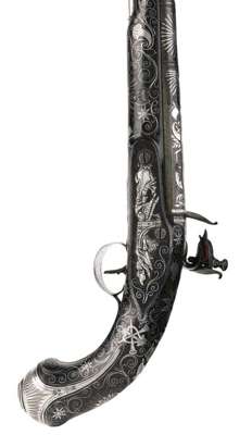 A fine silver inlaid flintlock fowling piece for the Turkish market and a case of duelling pistols by this maker from the Keith Neal Collection is on display in the Worshipful Company of Gunmakers proof house in London.