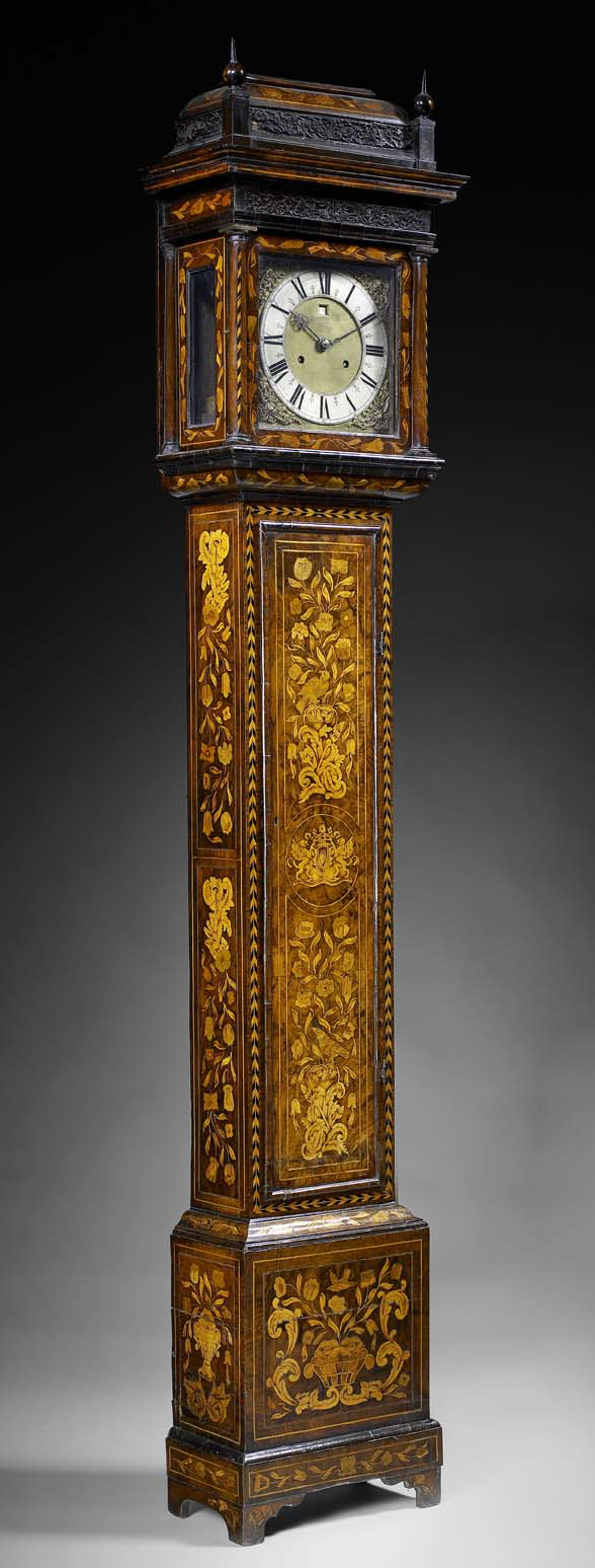 the twin train movement with recoil escapement striking the hours on a bell, , the 11" brass dial signed to the lower margin 'Joseph Knibb Londini Fecit', with chevron engraved perimeter and cherub mask spandrels around a silvered Roman chapter ring enclosing a matted centre with date aperture, the hood with caddy top, blind fretwork friezes and spire finials above a long trunk door with central armorial of a crown supported by griffins, on a stepped apron with bracket feet, the whole inlaid flower-filled jardinieres and perched birds within line inlaid and trailing vine borders (movement significantly adapted)