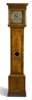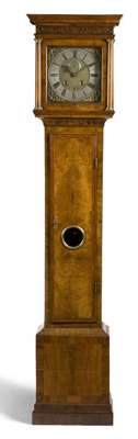 the square dial with a silvered chapter, signed Jn. Crucefix, London, with Roman numeral and sword hilt half hour markers, the matted centre with subsidiary second dial and date aperture, within crowned coronet cherub spandrels, the bell striking five pillar movement with anchor escapement, the square hood with blind fret carved frieze and twin capped turned pilasters, above a feather door centred by a brass ringed lenticle, raised on a plinth base