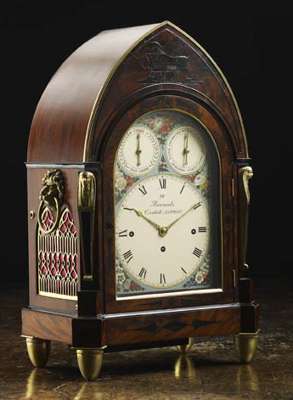 the arched floral festoon painted dial signed Barrauds, Cornhill, London, with subsidiary dials for chime/silent and tune selection, the similarly signed and foliate engraved three train fusee and chain movement, chiming on the quarter hour and playing one of seven tunes on thirteen bells, the arched case inlaid with a lion cresting and flanked by twin sphinx caryatids, with gothic pierced sound frets and raised on brass toupie feet