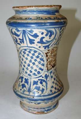 A late 17th century Caltigarone maiolica albarello, circa 1680