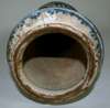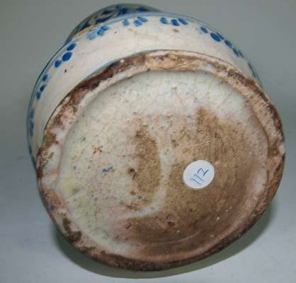 of waisted cylindrical form, painted with trellis and scroll panels in blue and sponged manganese