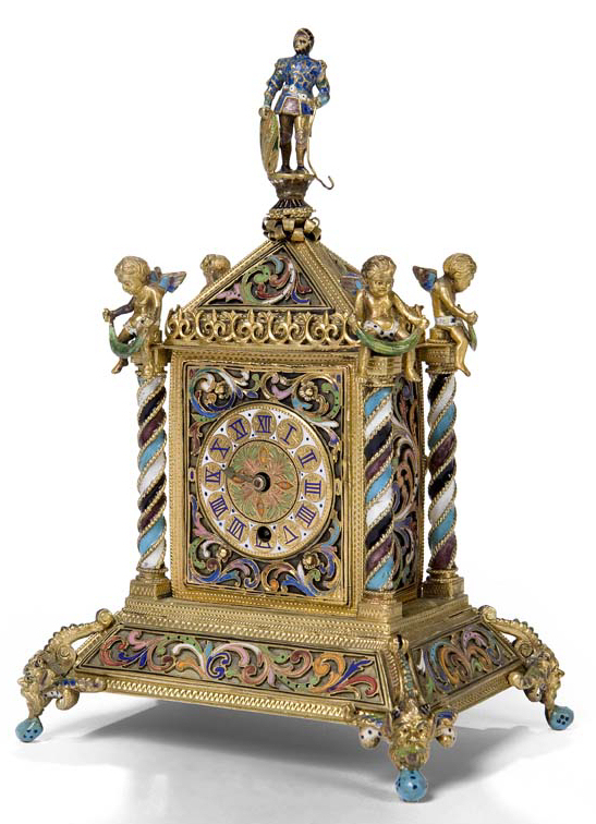 the case with enamelled scrolled foliage surmounted by a Renaissance soldier and winged putti atop the spiral twist columns, the spreading base on jester mask and ball feet