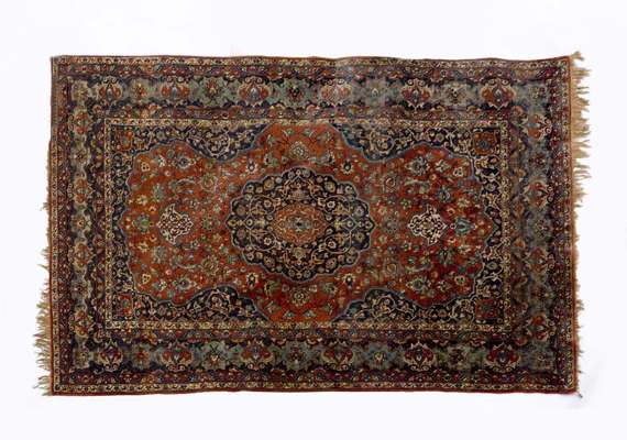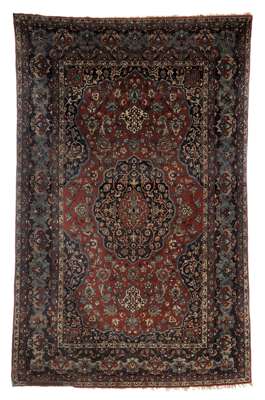 the red field with central indigo and red medallion suspending pendants, similar spandrels, within indigo and blue palmette and cartouche border between bands