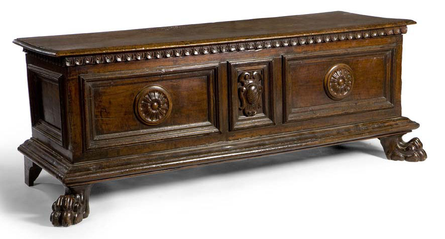 the one piece moulded hinged lid with an dentil carved frieze, the interior later lined and with a concealed sliding compartment to the left, the moulded panelled front with later applied mouldings above a deep moulded apron and claw feet