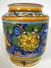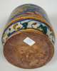 of cylindrical form, painted in blue, yellow, orange and green, with a band of stylised flowers and foliage on a blue ground with incised sgraffito scrolls scratched through the blue, with borders of foliate scrolls on the shoulder and sloping foot
