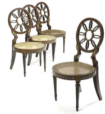 each wheel back with Greek borders and painted eagle leg supports above cane seat with a palmette decorated apron, raised on simulated reeded turned legs (4)