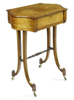 with brass line inlay, the oblong top with bowed ends above a frieze drawer and leather inset slide, the slender square outline twin supports joined by a ring turned stretcher and sweeping down to patera topped cylinder feet and brass castors