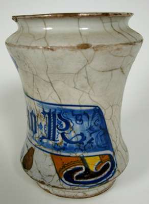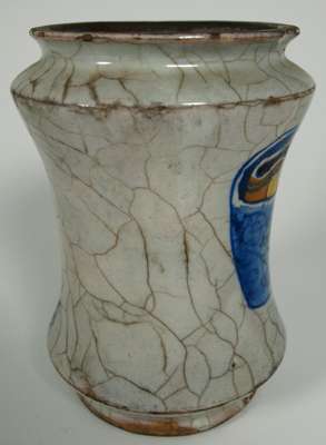 For a similarly shaped and decorated albarello (but not from the same series) see Jeanne Giacomotti, 'Catalogue des Majoliques de Musees Nationaux', (Paris, 1974), p. 241, cat.789.This example is dated '1555.' and attributed to Castel Durante.