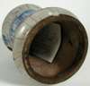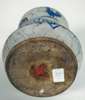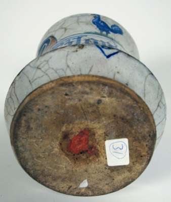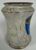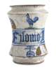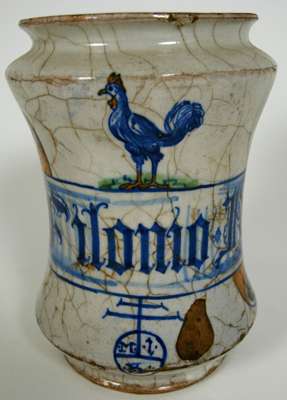 of waisted cylindrical form, painted in dark blue, green and orange with a drug label in gothic script beneath the crest of a cockerel, a pharmacy badge below