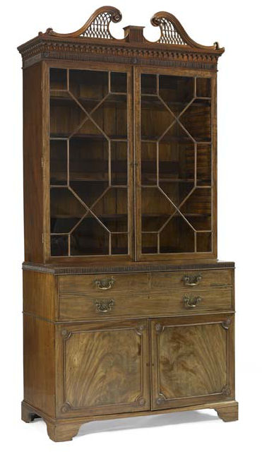 the fretwork pierced swan-neck pediment above a dentil and drop cornice and a fluted frieze centred by a patera, the pair of glazed doors enclosing adjustable shelves above a secretaire drawer and a pair of cupboard doors, on bracket feet