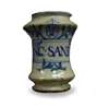 of waisted cylindrical form, painted with a pharmacy badge inscribed 'SL/M' above a polychrome painted leaf sprigged scroll inscribed with 'VNoC.SANDAii'