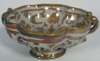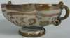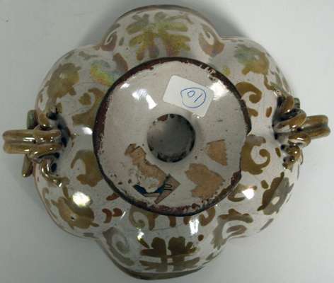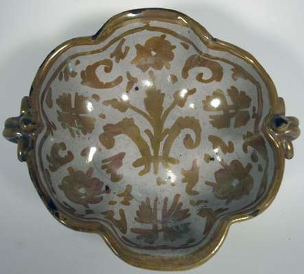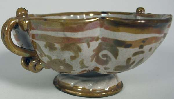 of circular lobed form, with serpentine handles, raised on a circular spreading foot, painted in gold lustre with fleur-de-lys and scrolling foliage