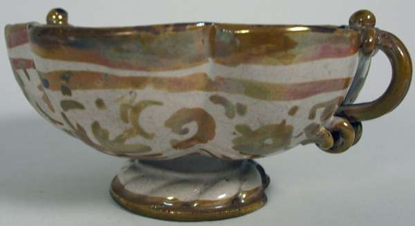 See Jeanne Giacomotti, 'Catalogue des Majoliques de Musees Nationaux', (Paris, 1974), p. 431, cat.1289.This illustrates a two handled bowl with smaller lobes but similar painting attributed to Deruta first half of the 17th century