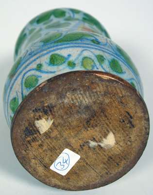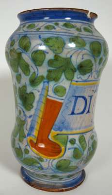 See Julia E. Poole, 'Italian Maiolica and Incised Slipware in the Fitzwilliam Museum Cambridge', (Cambidge, 1995), p.302, cat 373, for a pharmacy bottle with similar distinctive foliage decoration and scroll terminal.
