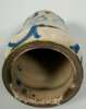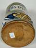 of shouldered cylindrical form, polychrome painted with an oval panel and central drug label 'AD.PRVIS', (odeps prunus - prune grease), with a frame containing panels of trophies and with bold scrolling foliage to the reverse, one trophy dated 1566