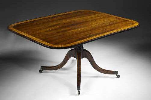the oblong top with a satinwood border inlaid with scrolls and formal foliage, with column support and downswept legs ending in brass caps and castors