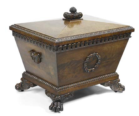 of sarcophagus form, the panelled domed hinged lid with knop finial and enclosing a lined interior, with lappet carved frieze, husk wreath and scroll side handles, raised on claw feet with concealed castors