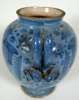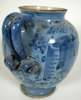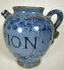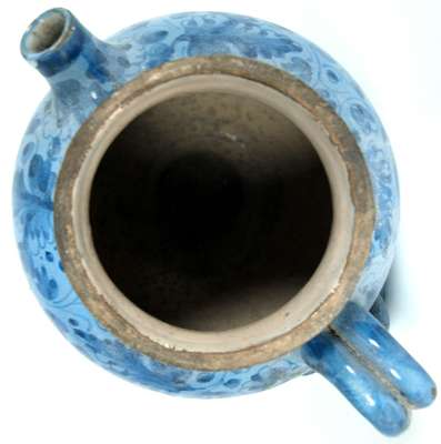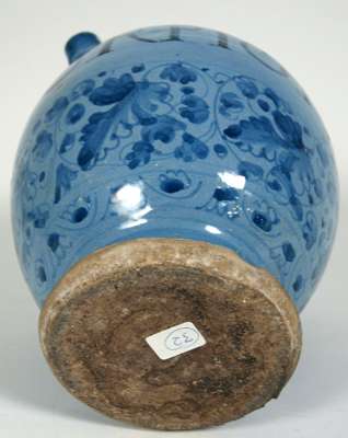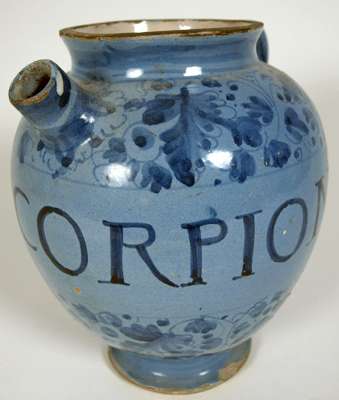 of ovoid shape with a serpentine handle, decorated in the berettino style with dark blue oak leaves and plant scrolls and drug label 'OL.SCORPION' (scorpion oil), on pale blue ground