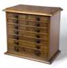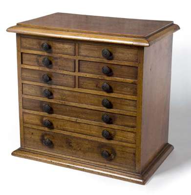the moulded rectangular top above three pairs of short drawers, three long shallow drawers and a long deeper drawer, on moulded base, each drawer holding a collection of archaeological or fossil finds