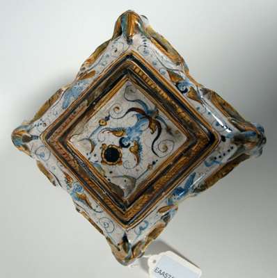A Tuscan maiolica salt from Montelupo or Pisa, decorated 'a compendiario', probably 1590-1610