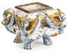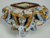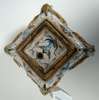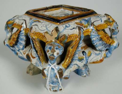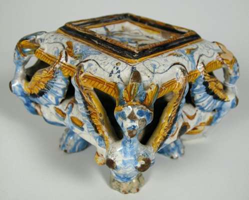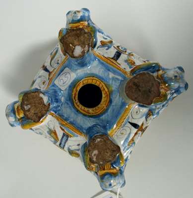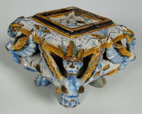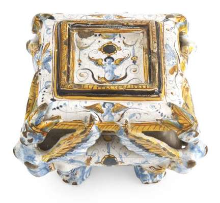 of square moulded form, with applied moulded female caryatids each with distinctive moulded three feathered head-dresses to each corner, painted in light blue, yellow, orange, and black, painted to the centre 'a compendiario' with a winged grotesque below a black cameo, smaller winged grotesques heads with swags of material, pearls and cameos to the exterior