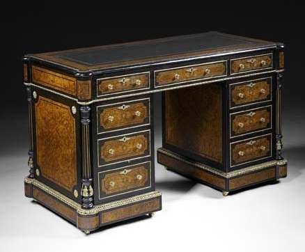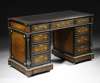 A Victorian amboyna and ebonised pedestal kneehole desk, circa 1890 Stamped Edwards and Roberts
