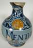 of ovoid shape, decorated in the berrettino style with blue scrolling leaves heightened in white on a light blue ground, with a coloured sun crest above drug label 'Aq Menthe' and pharmacy badge initialled CG/L (damages)