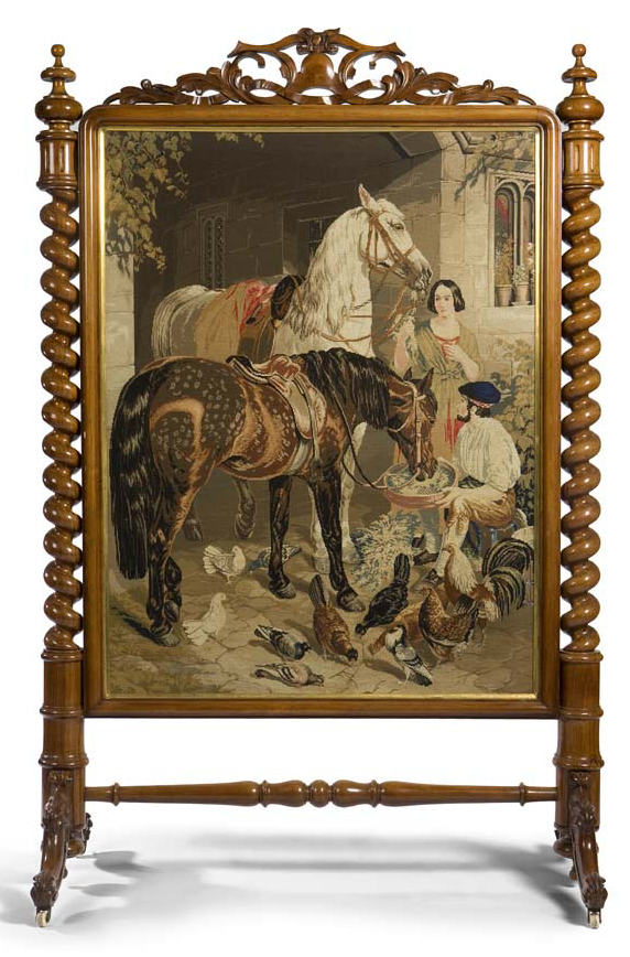 the rectangular screen inset with a gros and petit point panel depicting figures and horses in a stable yard, surmounted by a fret pierced foliate carved cresting and flanked by twin spiral turned pilasters, raised on carved cabriole legs ending ceramic castors
