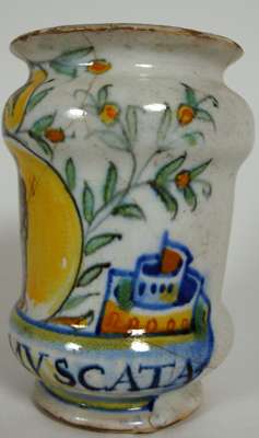 See Rudolf E. A. Drey, 'Apothecary Jars', (London, 1978), p. 203 for contents: 'lozenges composed of aloë-wood, musk, ambergris, gum tragacanth and rose water. Used as a restorative.'